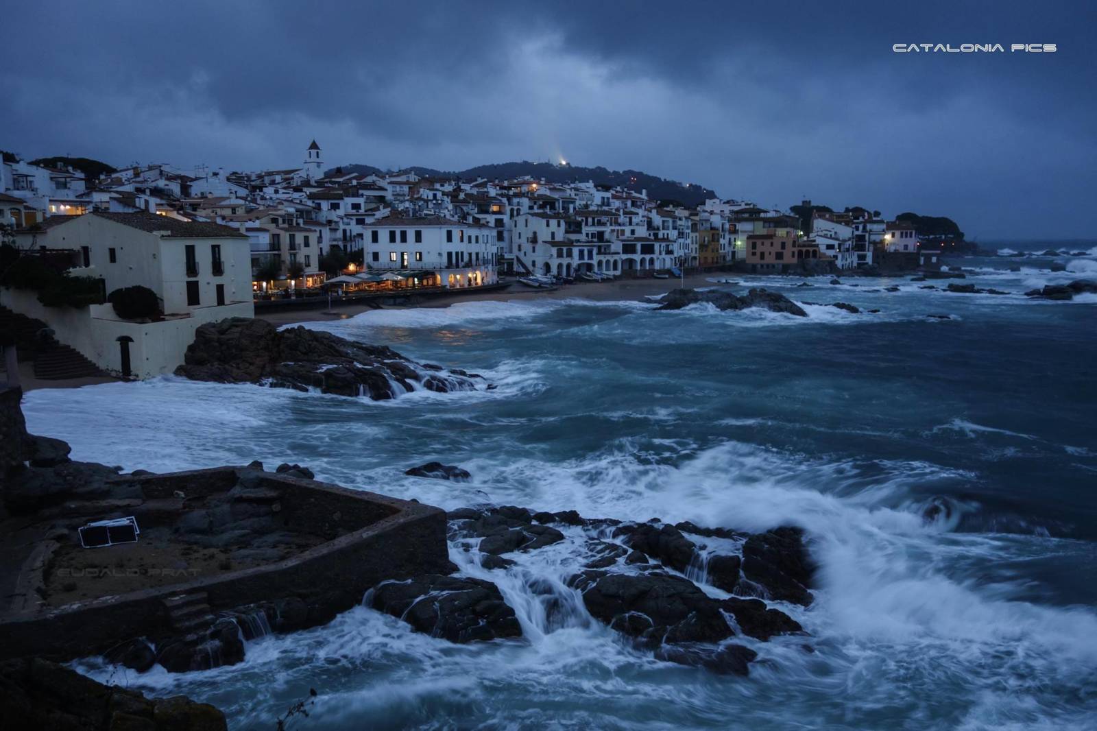 Wenn der Levante mit voller Kraft weht – ein Phänomen, das bei uns in Katalonien als „Llevantada“ bekannt ist – verändert sich das Mittelmeer auch in Calella de Palafrugell: Große, gewaltige Wellen dominieren plötzlich eine Landschaft, die üblicherweise ganz ruhig daliegt. Eine beeindruckende Erscheinung, die man jedoch zur eigenen Sicherheit am besten aus vernünftiger Entfernung bewundern sollte. So machte es Eudald Prat, der „Vater“ des hübschen, beigefügten Fotos. Im Hintergrund, oben auf dem Hügel, brennt das Licht des Leuchtturmes Sant Sebastià.