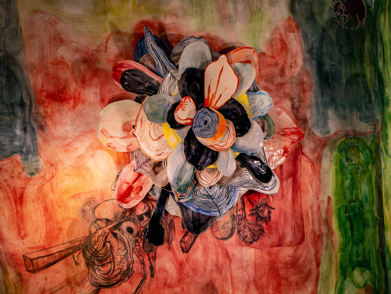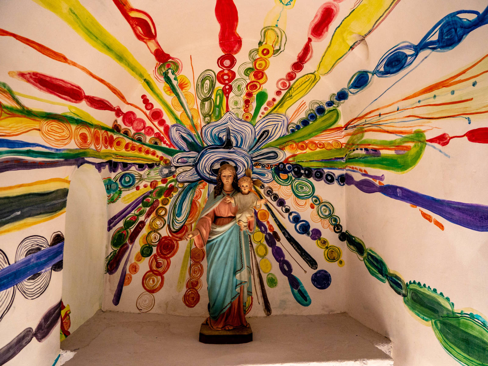 Der nächtliche Sternenhimmel, die Tiere und Pflanzen, sogar Licht und Wasser finden sich an den Wänden wieder. Neben christlichen Motiven wie einem Paulus, der die Säule der Kirche darstellt und den vier Evangelisten, sind es vor allem Szenen, die das Leben im Tal zeigen. An der Wand hinter dem schlichten Altar prangt kein Kreuz, sondern eine riesige bunte Blume. Auf den ersten Blick scheint sie leicht wie aus Papier. Erst bei genauerem Hinsehen erkennt man, dass die aus Keramik gefertigte Blüte an die dreihundert Kilogramm wiegt.