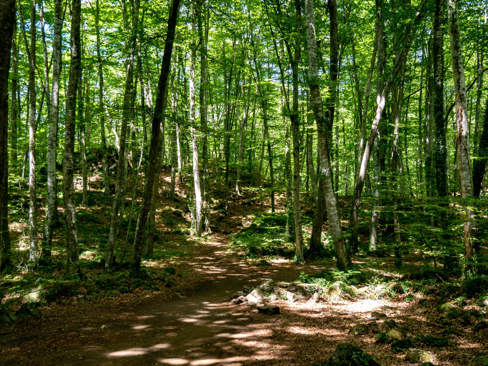 Auf genau diesem seitlichen Lavastrom wuchs im Laufe der Jahrtausende ein ganz besonderer Wald, la Fageda d’en Jordà. Sobald man den Buchenhain betritt, spürt man eine besondere Stille. Wie in einem kleinen Zauberwald fällt das Sonnenlicht hier ganz behutsam durch das grüne Blätterdach. Der steinige Untergrund des Lavastroms macht es den Bäumen nicht gerade leicht mit ihren Wurzeln an das Grundwasser vorzudringen. Daher sorgen die schlanken, glatten Stämme der Buchen dafür, dass das Regenwasser möglichst glatt an ihnen herunterrinnt und nahe der Wurzeln in den Boden einsickern kann. Außer den geraden hochgewachsenen Buchen gedeiht hier relativ wenig. Im Gegensatz zu der reichen Flora und Fauna der Felder und Wiesen rings um die Vulkane, findet man hier im Buchenwald lediglich ein wenig Moos auf den Steinen.
