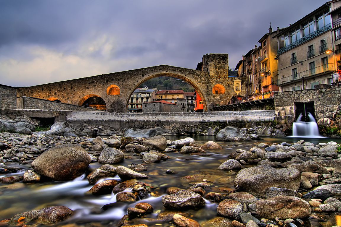 Weiter nördlich – auf halber Strecke zwischen Olot und Ripoll – liegt Camprodon. Die Erkundung des erstmals im 12. Jahrhundert urkundlich erwähnten Dorfes kann schon einmal einen ganzen Tag in Anspruch nehmen – so reich ist Camprodon an Monumenten (und Attraktionen). Stellvertretend sei die sogenannte „neue Brücke“ („El Pont nou“) erwähnt, eine mittelalterliche Kreisbogenbrücke über den Ter.